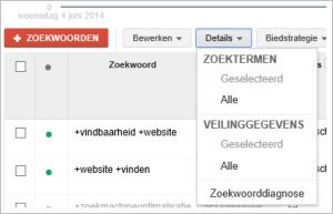 Het is jammer dat veel Adwords-gebruikers de waarde van het zoektermenrapport niet kennen. Het biedt namelijk veel inzicht in het zoekgedrag van uw doelgroep. Vraag het rapport op door in het zoekwoordenscherm op de knop ‘Details’ te klikken en daarna ‘Alle’ te kiezen.